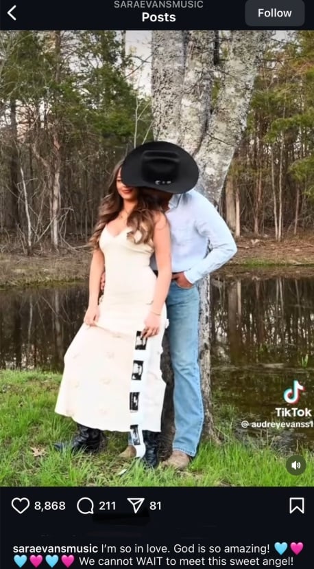 Country singer Sara Evans revealed to her social media followers that her daughter, Audrey, was pregnant with her first child with boyfriend John Headly back in April.